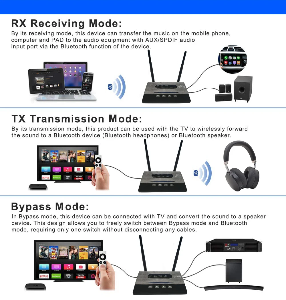 3 IN 1 -TX &RX &BYPASS MODE--TX Mode: connect Bluetooth transmitter to audio output devices, such as TV, iPod or PC, You can enjoy ultra-fast, high-fidelity audio from your Bluetooth headsets, headphones or speakers flexibility. RX Mode: make your old home stereo system Bluetooth-enable and rejuvenate again. Bypass Mode (wired): you no longer need to plug/unplug any wires, easily switch it to other two modes.