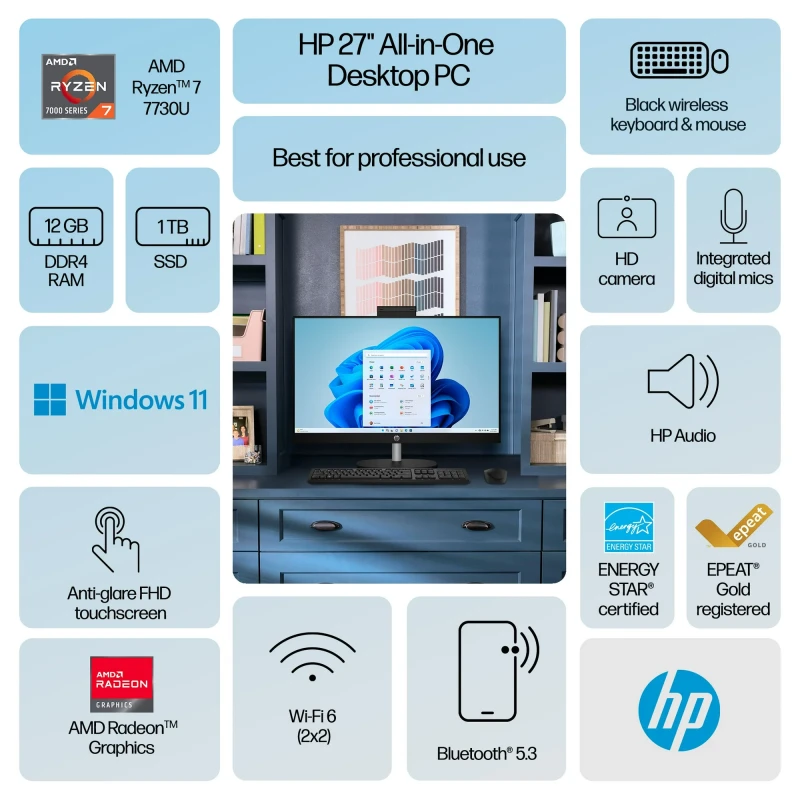 Powerful HP 27-inch Touch All-in-One AMD Ryzen 12GB, 1TB SSD